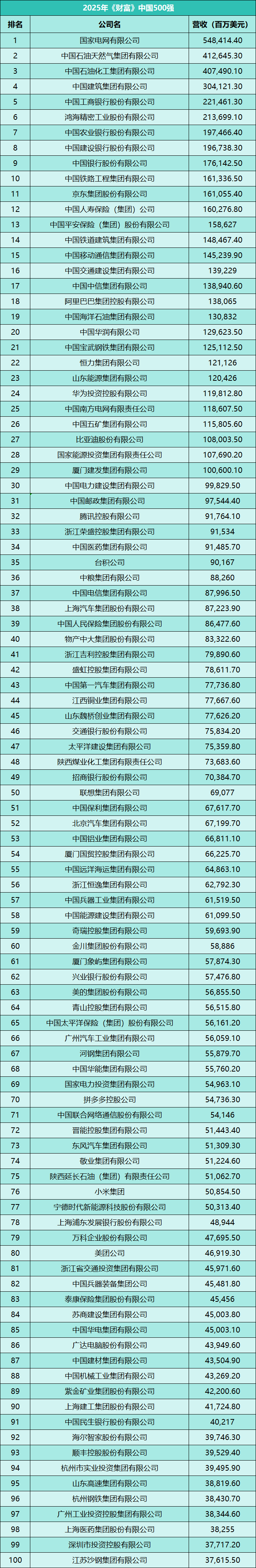 国家电网有限公司以5484亿美元的营收位居榜首,中国石油和中国石化分列榜单第二位和第三位。