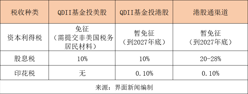 某公募投研人士在接受界面新闻采访时表示:“目前QDII基金以投资美股和港股为主,两地的税收情况也不同。”