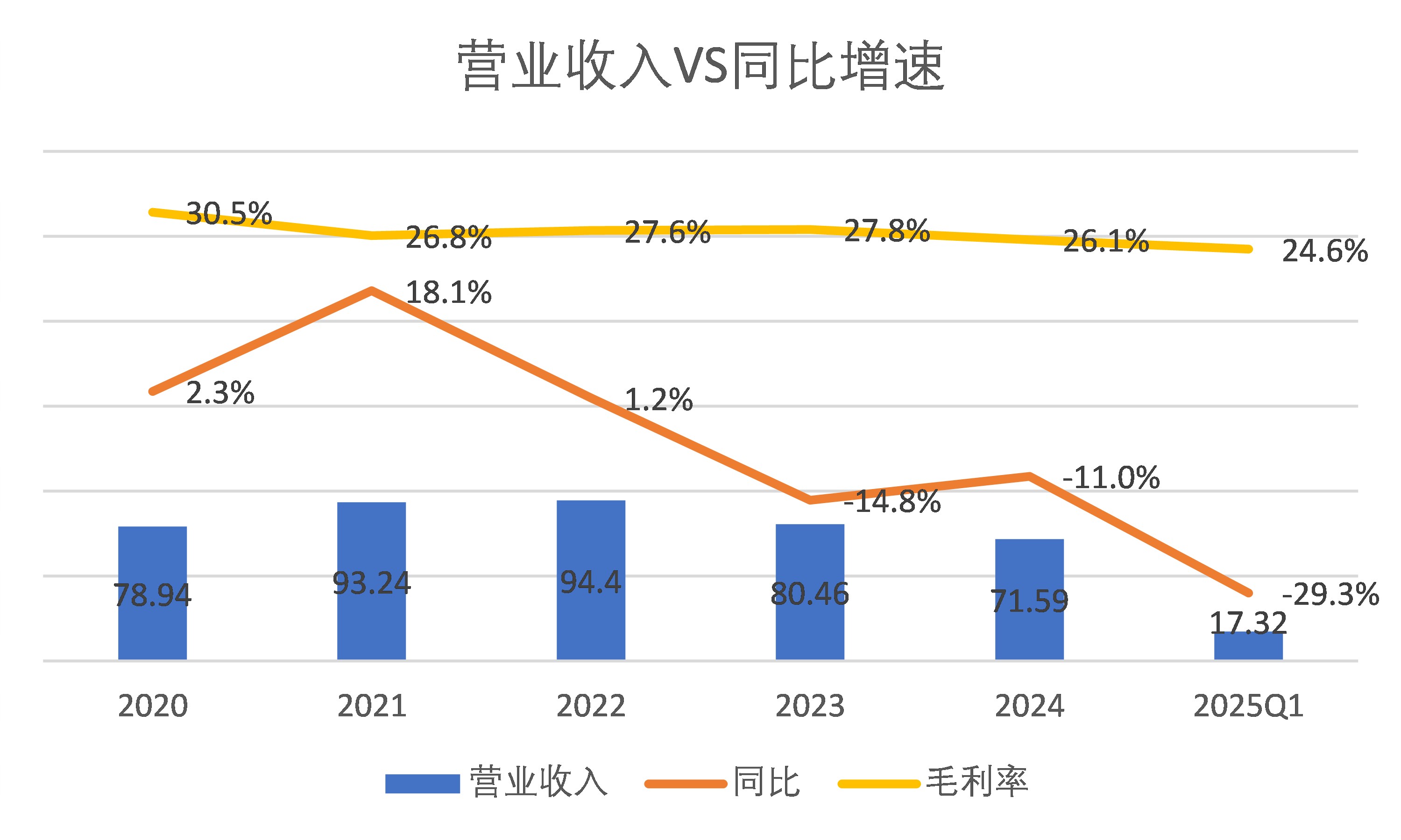 良品铺子的业绩崩坏始于收入端萎缩。2022年94.4亿元的峰值成为绝唱,此后三年营收曲线一路俯冲:2023年80.46亿,2024年71.59亿,2025年一季度同比再降29.34%。曾经引以为傲的毛利率,从2019年31.87%的高点一路坍塌至2025年一季度的24.37%。