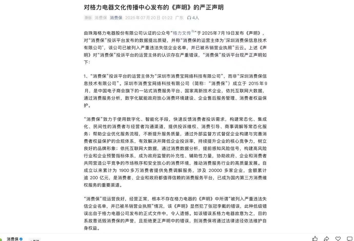 面对格力电器质疑,7月20日凌晨“消费保”发文回应,“消费保”现运营良好,经营正常,根本不存在格力电器的《声明》中所谓“被列入严重违法失信企业名单,并已被吊销营业执照”情况。