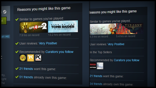 这个栏目将让您窥见黑盒的内部,理解商店的考量。我们希望,不论您何时来探索商店,但是尤其是当您通过外部页面直接导航某个游戏的商店页面时,它都会有用。在这些情况下,这个栏目将帮助您了解商店是否会推荐这款游戏给您。换种情况,如果您确切知道为什么商店会推荐某款游戏,那您会对商店推荐的更感兴趣(或更不感兴趣)。例如,知道某个好友或鉴赏家喜欢或不喜欢一款游戏可能影响您的购买决定。最后,如果商店推荐了您明知不会感兴趣的内容,您就知道商店的算法哪里出现了偏差——请务必告诉我们。