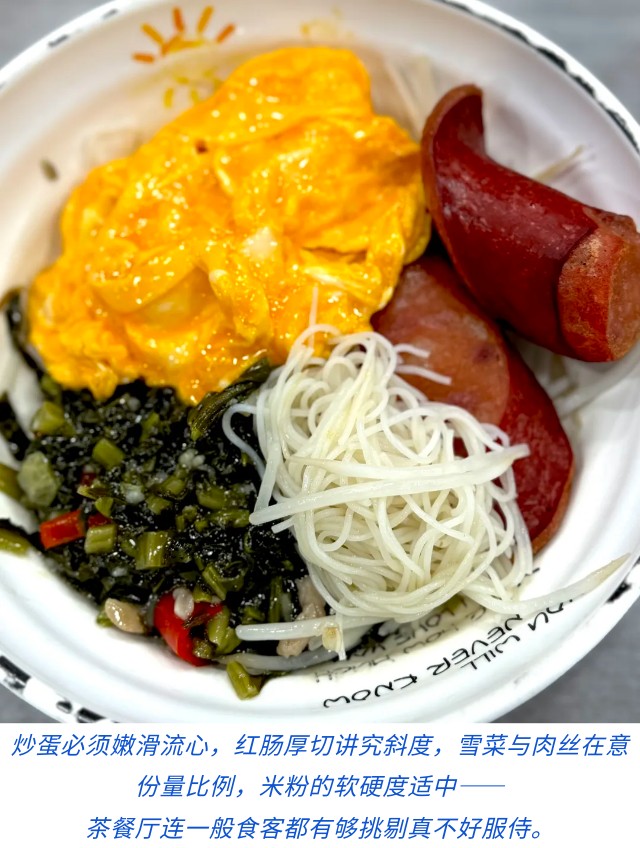 当然以经营用心程度和厨房对食材选择食物烹调标准来说,茶餐厅也肯定是有档次之分的。我常去的一家叫「好好运」,一个土得大声念出来也会失笑的店名——— 「我在好好运等你」,既好彩头又讨喜。「好好运」的热卖名物是沙嗲牛肉,跟方便面是绝配,但一大清早这么重口味我是受不了,所以几经尝试我的标准配搭是雪菜肉丝干拌米粉配炒滑蛋和两大片煎得香脆的红肠,喝的当然是热奶茶,偶尔「健康」一点会点热柠檬水,套餐盛惠港币52元,收的算是同区茶餐厅一个中上价钱,但以用料烹调和服务来说,就是吃得舒服自在满意。