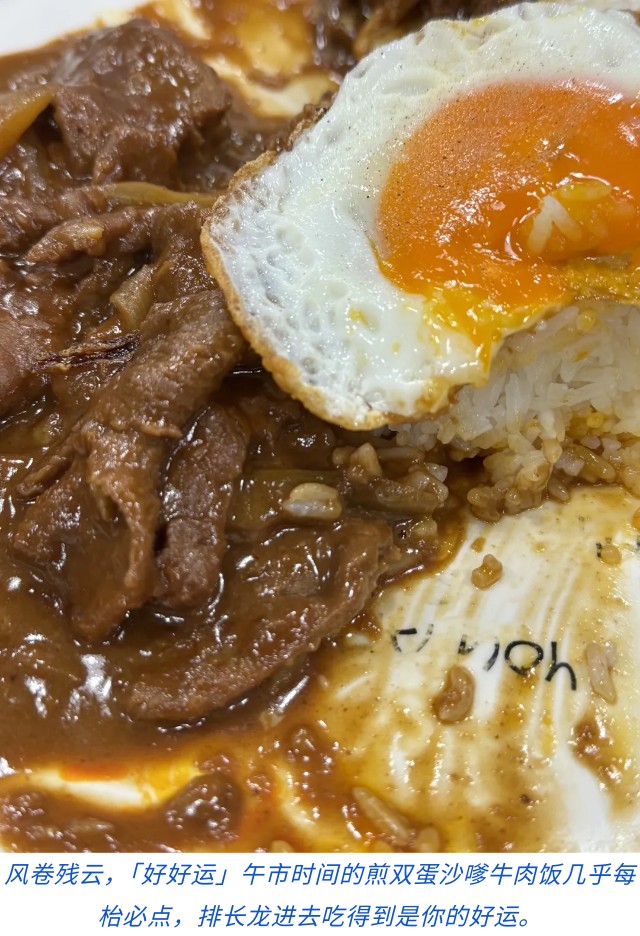 所以每天七点半准时开始营业的「好好运」,早午高峰期门外都有人龙。对于「打自己工」的我,总能够避开繁忙时间,在晨早、午后,以致傍晚五点打烊前,都会经常帮衬。早餐是不变的虔诚的选择,中午会来一份煎双蛋沙嗲牛肉饭或者炒蛋煎猪扒意粉配黑椒汁。而在下午四点过后客流开始稀疏,繁嚣混杂的工厂区竟然弥漫一种小资产阶级的慵懒,我会在这里放肆的order加了很多糖浆的西多士,咸牛肉煎蛋三文治烘底,甚至是生炸鸡腿配薯条,再配喝了晚上可能睡不着觉的热奶茶—— 好让一个完整的工作日来个顿号,小休过后继续回工作室,一直工作到晚上八、九点左右,再来盘旋晚饭如何。