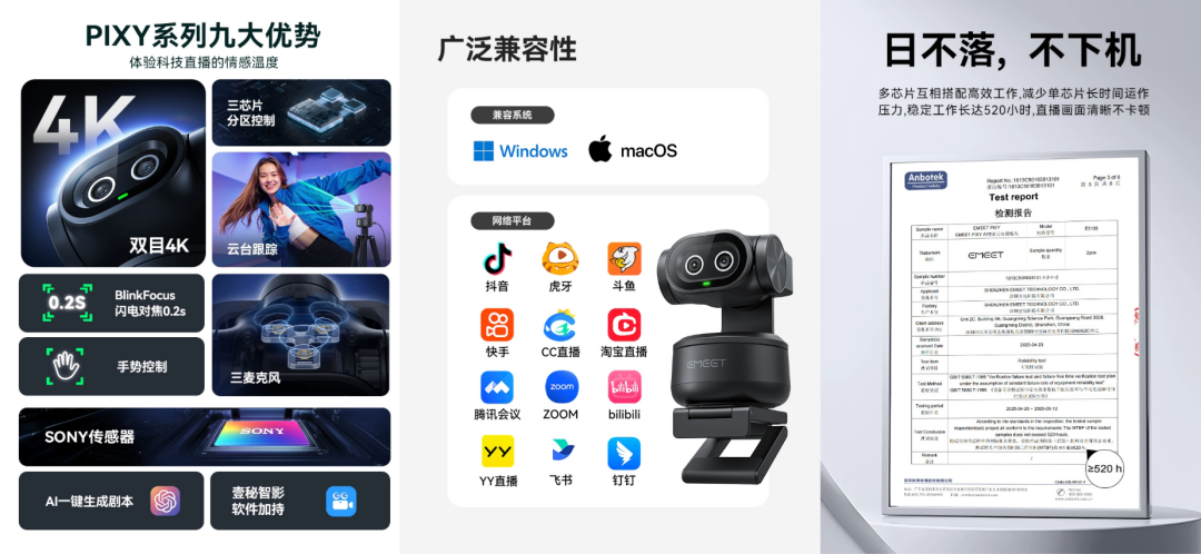 EMEET PIXY 以“双目4K+双AI追踪+0.2秒闪电对焦”的硬核配置,将专业级直播体验浓缩至千元设备。其软硬件协同的AI架构(如AI剧本生成、手势控制追踪),真正实现了“一人即是一个工作室”的创作自由——轻松满足日常分享,更能驾驭专业带货场景。品牌更提供一对一专业直播调试,助力设备性能最大化发挥。