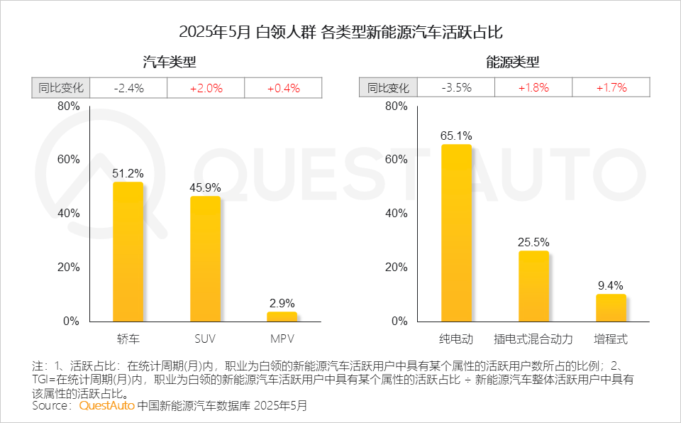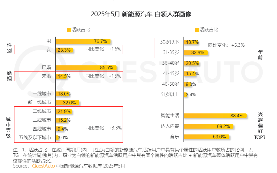 1、新能源汽车市场中,白领用户集中在已婚男性,身处一线、二线城市用户占比超七成,该群体中40岁以下占比达72%,该群体对智能生活、达人分享、音乐兴趣浓厚QuestAuto数据显示,2025年5月新能源汽车市场中,白领群体女性、中青年、二线及以下城市用户比例有所增长。