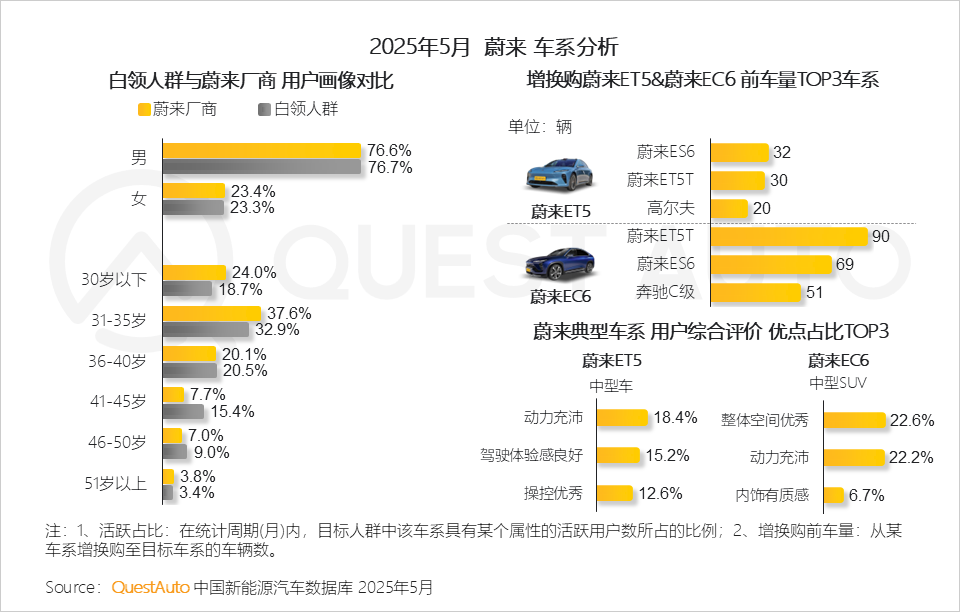 4、蔚来ET5和EC6在动力性能方面受到一致的好评,主要吸引同品牌用户增换购,品牌忠诚度较高QuestAuto数据显示,蔚来厂商与白领人群画像结构相似度较高,其中蔚来厂商中35岁以下人群占比61.6%。