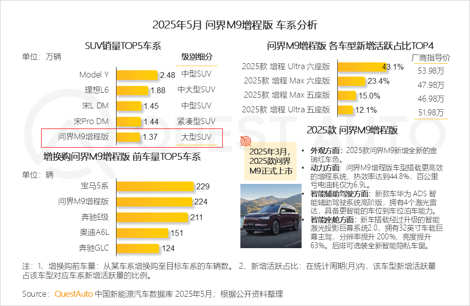 6、2025款问界M9上市,外观、动力、智能辅助驾驶及智能座舱等多维度升级,吸引BBA车主增换购,其中增程Ultra 六座版和Max六座版新增活跃占比分别达43.1%、23.4%,市场表现亮眼