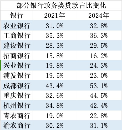 从政务类贷款占比来看,2024年股份行、农商行相对较低,在20%左右;国有大行在30%左右,城商行最高,其中成都银行、重庆银行、杭州银行超过40%,成都银行高达53.1%。