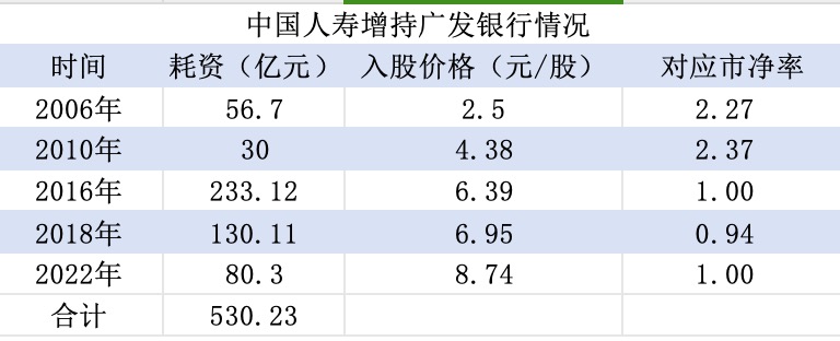 而在2006年花旗财团购买广发银行股权时,中国人寿就作为财团之一参与认购,此后中国人寿多次增持或受让广发银行股份,前后耗资530亿,每股价格市净率均在0.94倍以上。从这个角度看,广发银行破净上市并非中国人寿的优选。