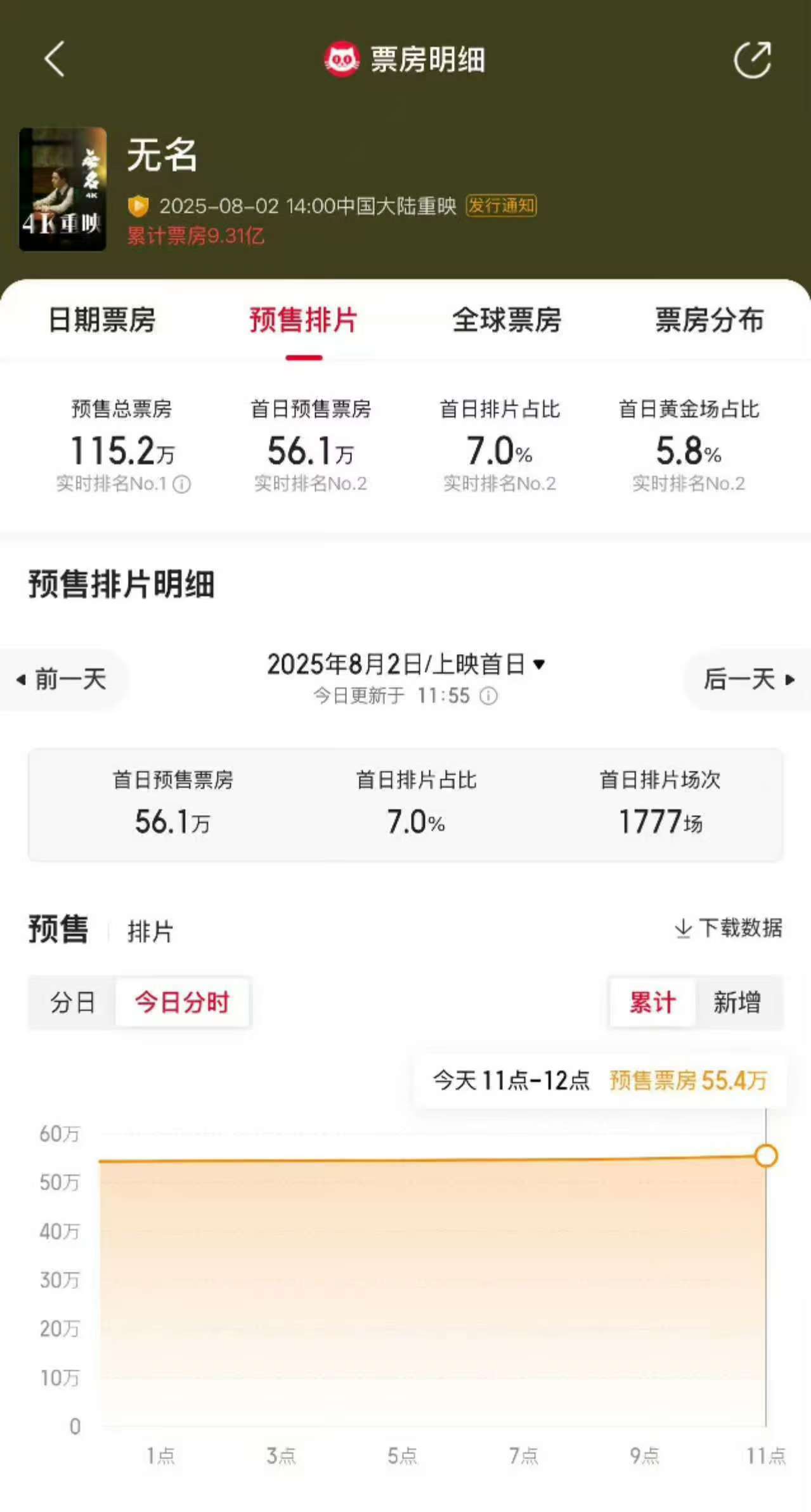 电影 《无名》官宣8月2日部分影院重映,据猫眼专业版数据,截至当前《无名》重映预售票房已超115.2万,首日预售票房56.1万,王一博生日当天(8月5日)预售票房超32.8万,排片场次2428场,为重映首日外预售票房最高一天。