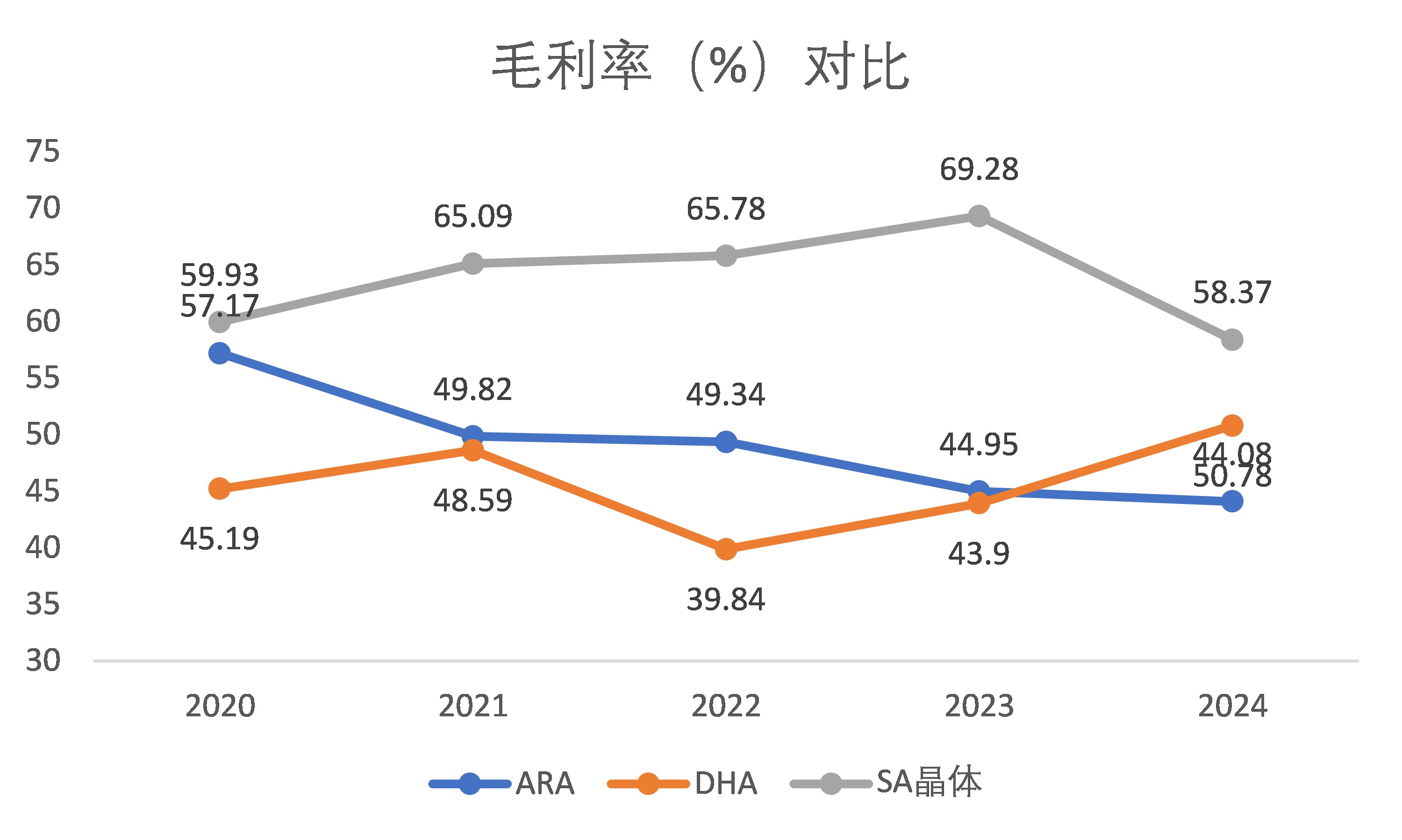 但这样一来,ARA的市场价格也开启了下行趋势。2023年,ARA的平均出厂价格下降了16.4%。嘉必优ARA的毛利率从2020年的57.17%下降13.09个百分点到2024年的44.08%。