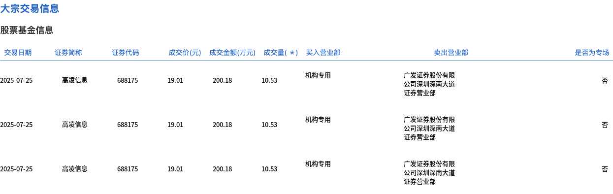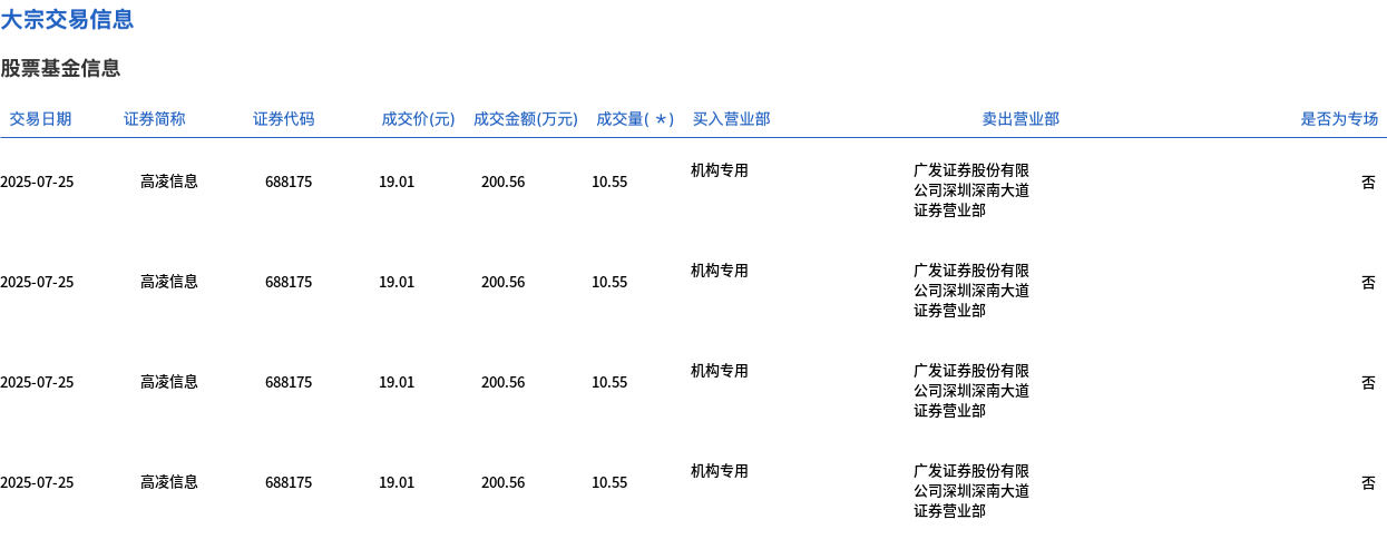 7月25日,高凌信息大宗交易成交73.79万股,成交额1402.78万元,占当日总成交额的21.09%,成交价19.01元,较市场收盘价20.81元折价8.65%。