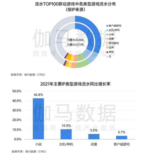 伽马数据《2021-2022移动游戏IP市场发展报告》显示,2021年IP改编移动游戏收入占移动游戏市场五成以上,但增长率不足5%。从IP类型来看,小说IP连续三年增长超40%,近年来多个小说IP得到影视化、动漫化与游戏化,多端共同作用放大了小说IP的商业价值。