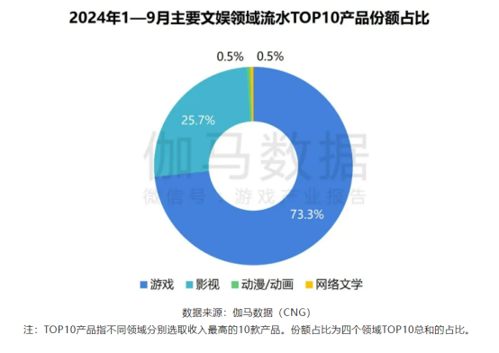虽然IP具备高价值,但当进入变现环节时,不同领域的IP布局却展现出了较大的流水差距:对比2024年主要领域流水TOP10的产品可见,“游戏”单一领域独占了73.3%的流水份额,变现能力显著高于其他领域,网文和动漫/动画分别只有0.5%。