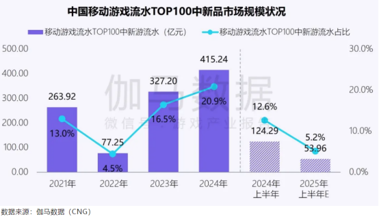 长青和长线是当下游戏行业发展的重要趋势,2024年,流水TOP100游戏产品平均运营时长已达7年,而新品整体活力有待提升。2025年上半年TOP100产品中新品流水占比仅为5.2%,去年同期为12.6%。
