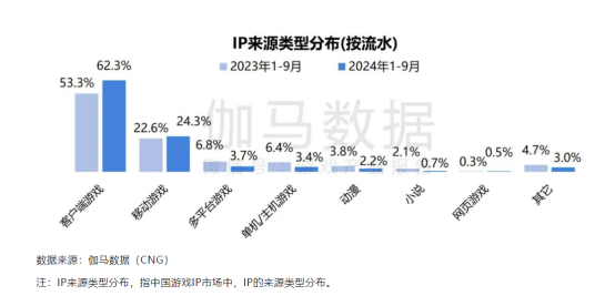 到了《2024中国游戏产业IP发展报告》中,2024前三季度小说IP改编占比从2.1%继续下滑到0.7%。