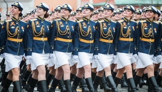 检阅开始后,徒步方队由齐步转正步依次走过俄总统普京所在的主席台,变步时所有人齐声高喊“数字一,数字二,正步!”,随后齐刷刷地向右甩头,将脸向斜上方扬起,面带笑意地看着观礼台。