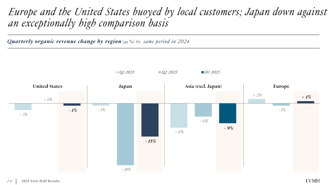 分地区看,2025上半年,包括中国在内的亚洲地区(除日本)上半年同比下降9%,其中第二季度跌幅有所收窄。目前,亚洲地区(除日本)仍是该集团最大的市场,贡献了LVMH集团28%的营收。