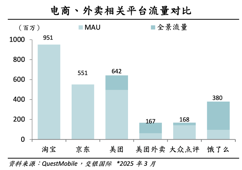 根据交银国际数据,2025年3月淘宝MAU接近10亿,饿了么接近4亿,两大平台接近有14亿的MAU(未排除重复用户),京东有5.5亿之多。新的平台介入外卖市场后,会对行业带来更的增长变量。