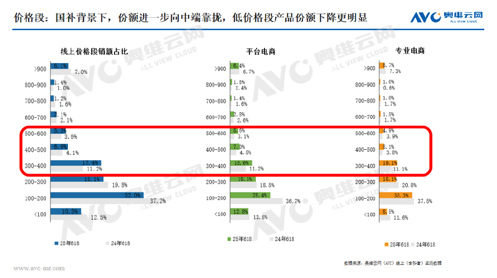 从不同价格段来看,用户往往倾向于在同等预算和价位的情况下购买更高品质的产品,低价格段的份额占比持续缩减,中端产品的占比增长,也是消费升级的表现之一。