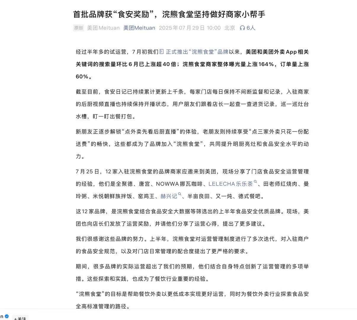 在这篇标题为《首批品牌获“食安奖励”,浣熊食堂坚持做好商家小帮手》的文章中,美团表示“只做好基础设施建设,帮助商家对接所需资源,把流量、品牌、销量都留给商家,把安心、便捷和品质留给消费者。”