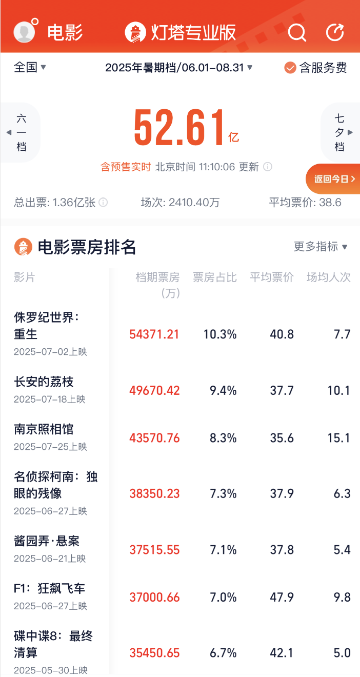 在往年,这通常是新片集中爆发、影院人流回暖的黄金期。但从目前的数据来看,今年暑期档整体表现低于预期,观影人次、上座率、单日票房峰值等指标,几乎在各个维度上都不及2023年、2024年。