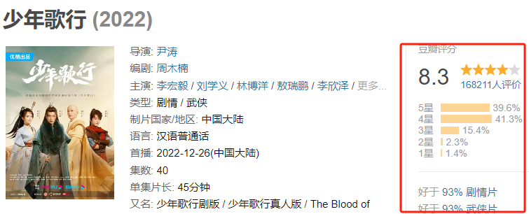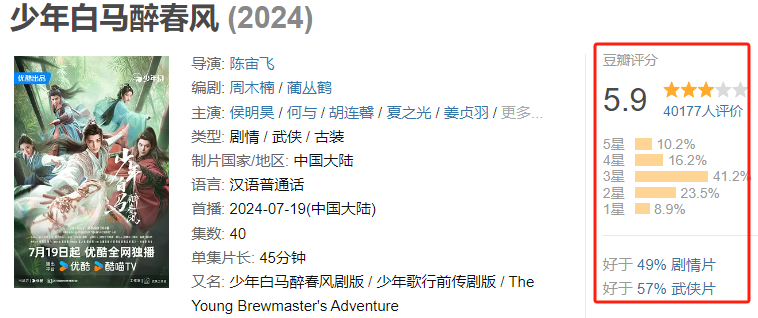 《少年白马醉春风》是“少年幻”官宣后的首部剧作,作为 “周木楠少年江湖系列”《少年歌行》前传,《少年白马醉春风》讲述了父辈百里东君、叶鼎之、司空长风年轻时的江湖际遇,与一众少年策马奔腾、既救苍生亦救挚友的故事,目前《少年白马醉春风》的剧版豆瓣5.9分,漫版7.5分。受《少年歌行》《异人之下》等爆款剧集的推动,《异人之下》豆瓣开分8.1,创漫改剧最高开分记录。《少年歌行》豆瓣评分依旧保持在8.3分高分,长尾效应显著。