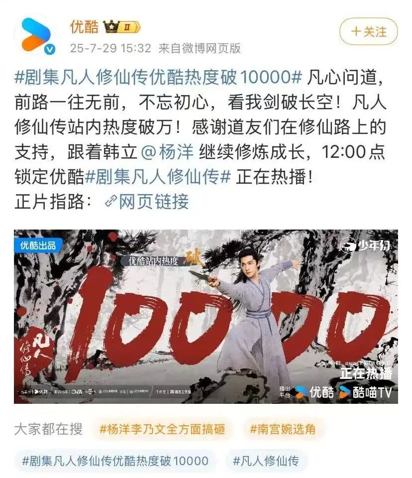 《凡人修仙传》上线优酷之后,立刻霸榜站内多个榜一,两天之内热度值破万,社交平台的讨论度也不断升温。