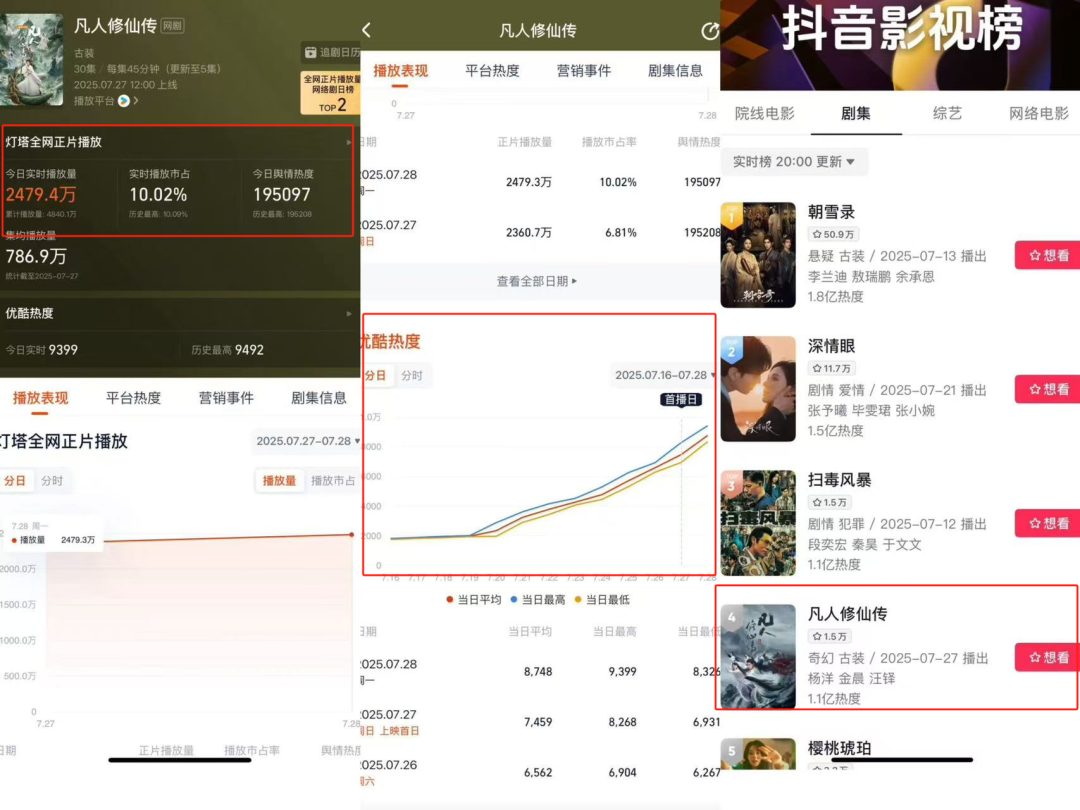 7月23日,《凡人修仙传》定档官宣后三小时,剧集就登上站内周榜,数值3560.93。开播前优酷站内热度7346,创平台历史最高预约纪录;首播两小时热度破7500,首日峰值达8326-8500,成为优酷2024年以来开播首日热度最高剧集。作为中午12点开播的男频剧,这样的成绩也算亮眼了。