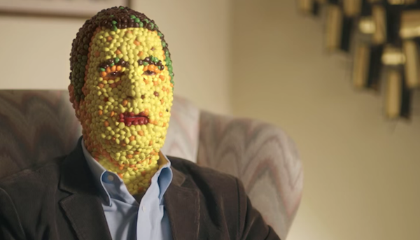 彩虹糖也玩过密集恐惧的梗:一个男人因为太热爱彩虹糖,从皮肤到头发都变成了密集排列的彩虹糖——他的家人甚至收集了一车从他身上掉下的彩虹糖送给街坊邻居。