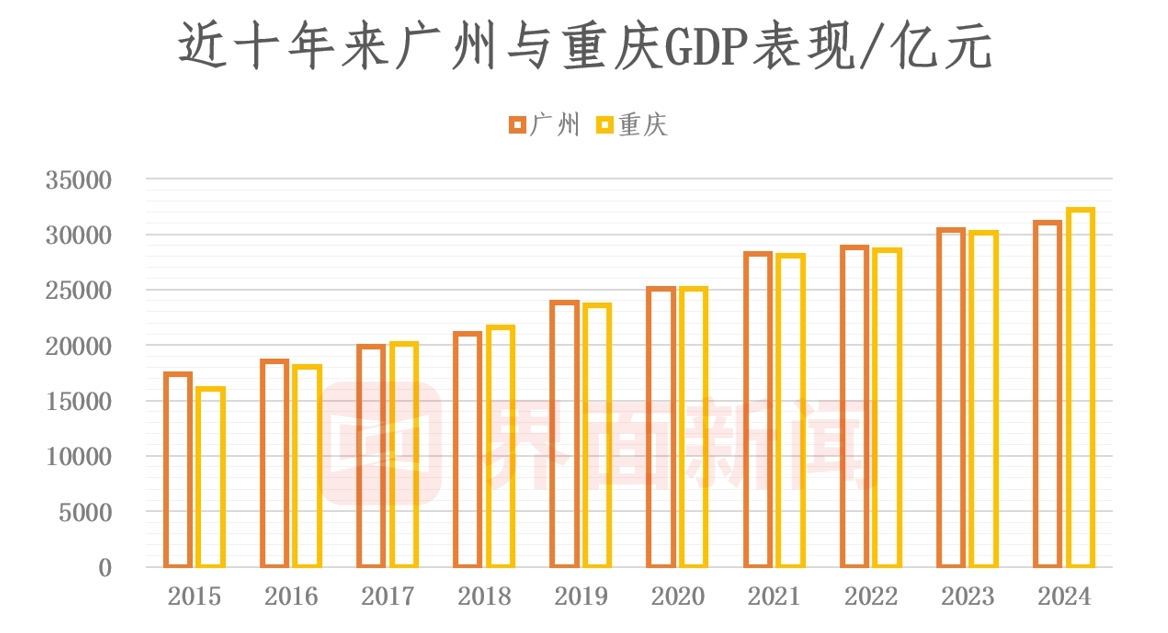 从经济总量来看,广州在内地城市中排名第五,对比上半年重庆GDP实现15929.58亿元、同比增长5.0%,广州经济总量落后重庆约848亿元。2024年全年,广州和重庆分别实现GDP 31032.5亿元和32193.15亿元。