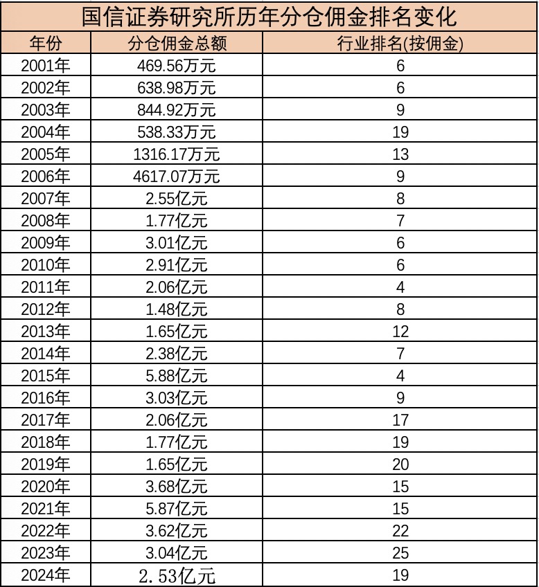 国信证券研究所目前的分仓佣金排名处在行业第二梯队,与其巅峰时期相比有着不小差距。