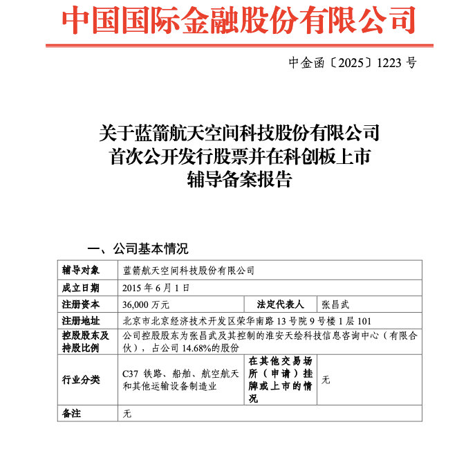 7月29日,商业航天运载火箭研发商蓝箭航天空间科技股份有限公司(下称:蓝箭航天)在北京证监局办理辅导备案登记,拟首次公开发行股票并在科创板上市,辅导机构为中金公司。