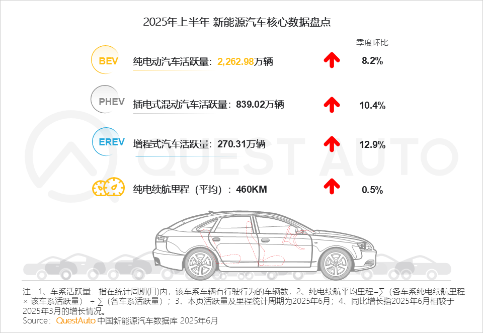2025年上半年,纯电动汽车活跃量突破2200万辆,纯电续航平均里程进一步提升,达到460KM,增程式汽车环比增速表现突出