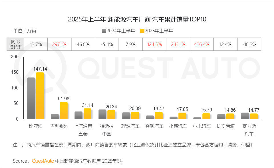 1、2025年上半年,得益于政策支持和市场需求的双重推动,新能源汽车厂商的销量实现了显著增长小米汽车、吉利银河、小鹏汽车及零跑汽车销量实现多倍增长,展现出强劲的市场表现。