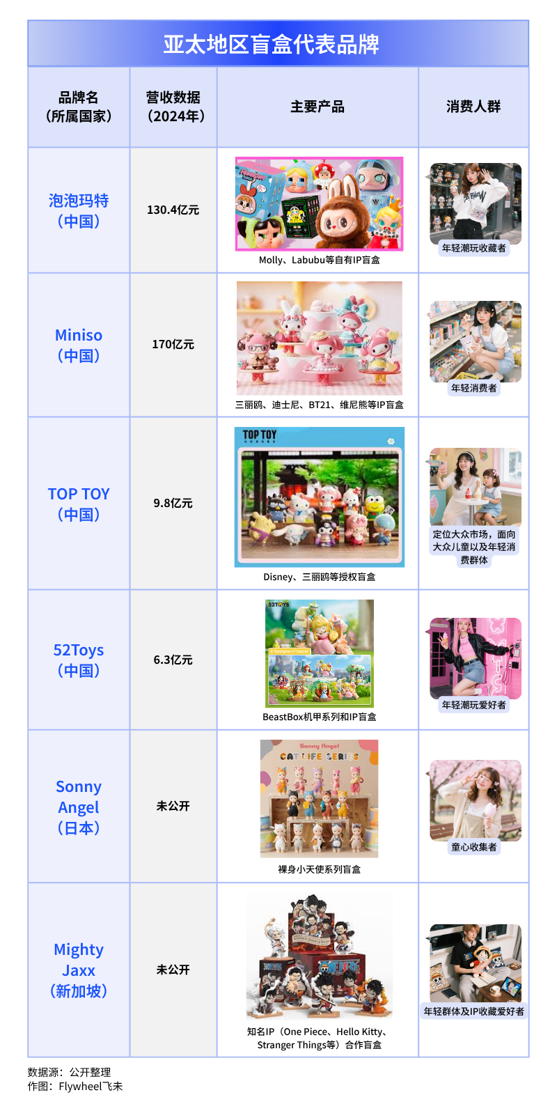 亚太地区盲盒核心品牌:泡泡玛特(中国)、Miniso(中国)、TOP TOY(中国)、52Toys(中国)、Sonny Angel(日本)、Mighty Jaxx(新加坡)