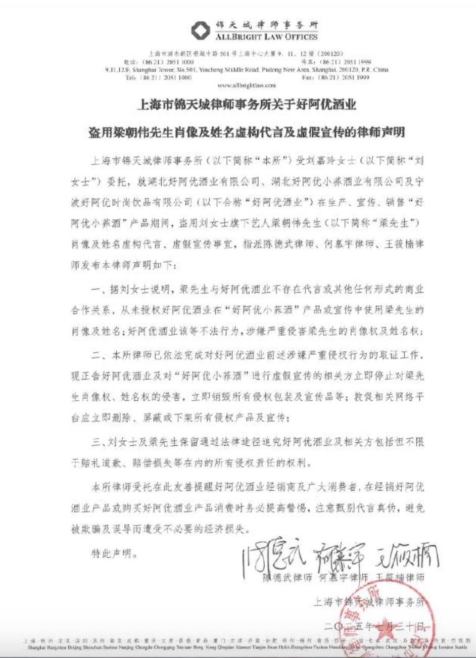 律师声明指出,梁朝伟与该酒业并无代言或任何形式的商业合作,从未授权好阿优酒业在 "好阿优小荞酒" 产品或宣传中使用梁先生的肖像及姓名;好阿优酒业该等不法行为,涉嫌严重侵害梁先生的肖像权及姓名权。
