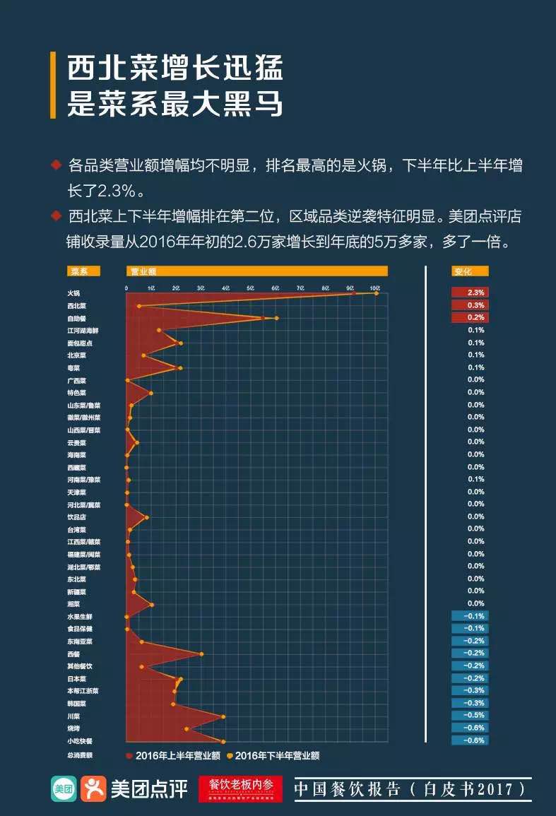就各大菜系而言,西北菜增幅最明显,入驻美团的店铺从2016年初的2.6万家增长至年底的5万多家。