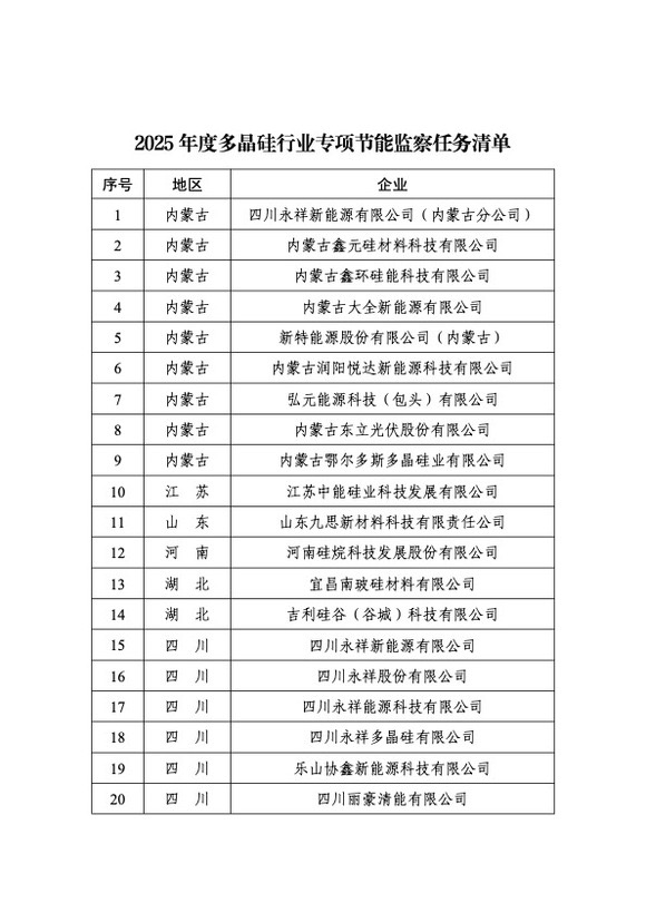 8月1日,工业和信息化部办公厅发布《关于印发2025年度多晶硅行业专项节能监察任务清单的通知》(下称《通知》)。