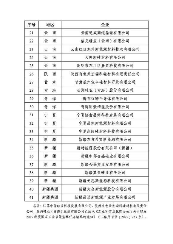 节能监察任务清单中,涉及了41家多晶硅企业,其中内蒙古9家、新疆8家、四川6家、云南5家,青海、宁夏各3家,湖北2家,江苏、山东、河南、陕西、甘肃各有1家。