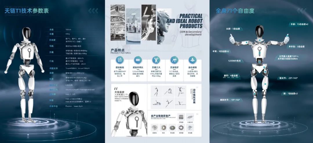 人形机器人方面,天链机器人自主研发的天链人形机器人T1,身高约1.60米,全身自由度71个,裸机仅重37公斤左右,含电池在43公斤左右,负重深蹲突破145kg,主要应用于影视娱乐、教育培训、康养护理、药物配送、军工产业、物流搬运、工业生产、家政服务场景。