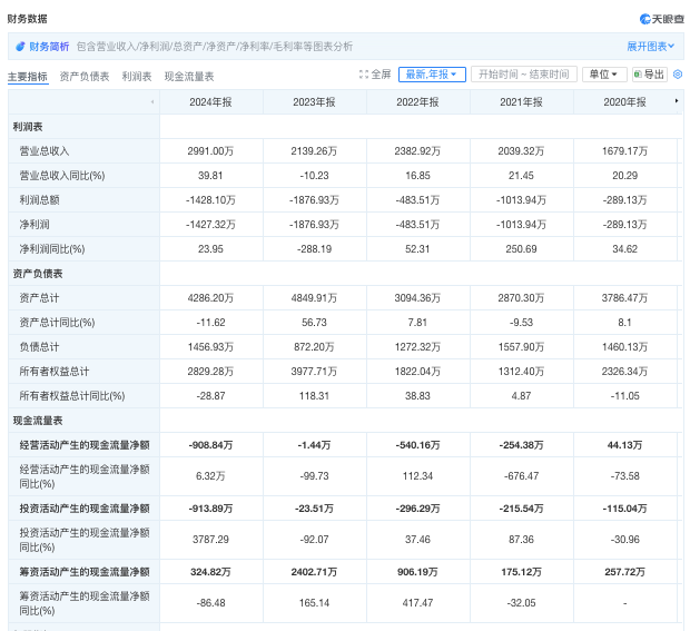 财务数据方面,2020-2024年,天链机器人的营业收入分别为1679.17万、2039.32万、2382.92万、2139.26万、2991.00万元;净亏损分别为289.13万、1013.94万、483.51万、1876.93万、1427.32万元;经营活动产生的现金流量净额分别为44.13万、-254.38万、-540.16万、-1.44万、-908.84万元。