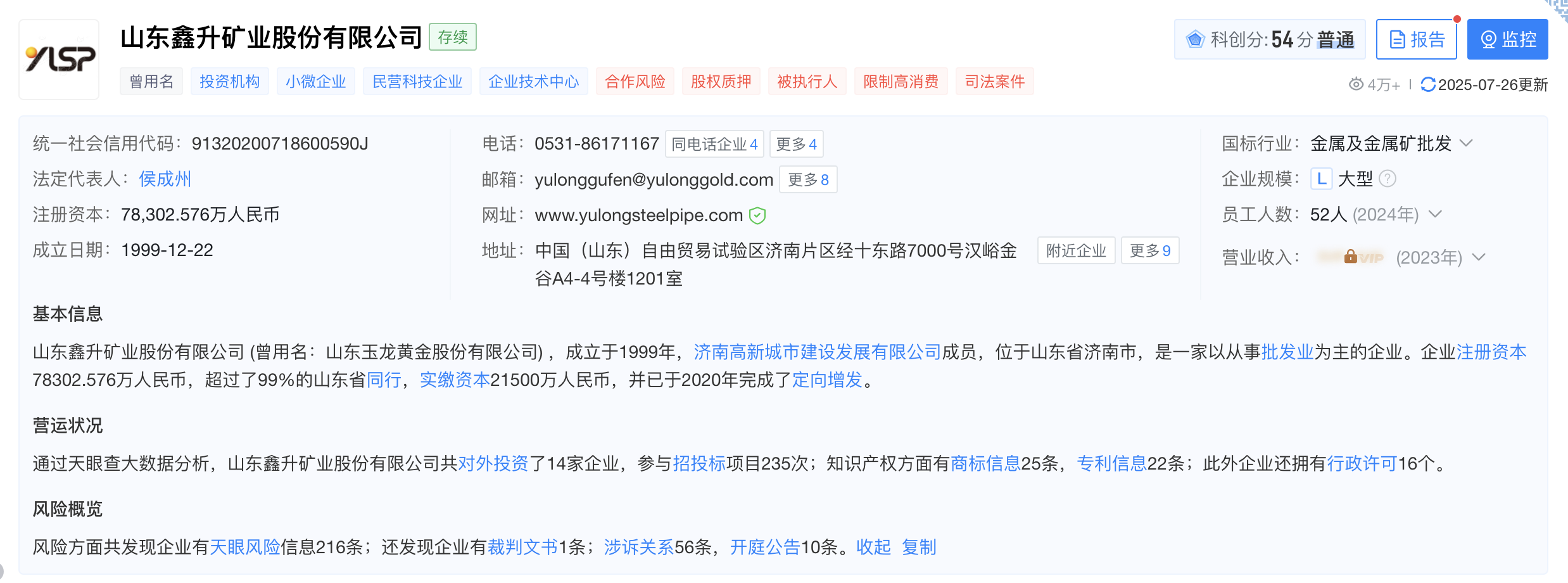 7月29日,天眼查APP资料显示,山东玉龙黄金股份有限公司完成工商登记变更,新名称为“山东鑫升矿业股份有限公司”。同时,公司法定代表人由牛磊变更为侯成州。