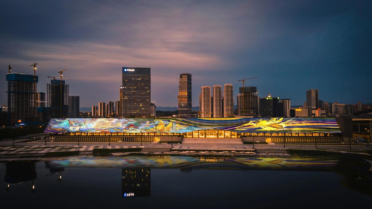 建筑正面看似“传统”的榫卯结构,实际上暗藏玄机:超大屋顶总长430米、宽26米,总面积约1.1万平方米,是目前世界上最长的“数字化屋顶显示屏幕”,成为呈现“开幕式”的理想载体。