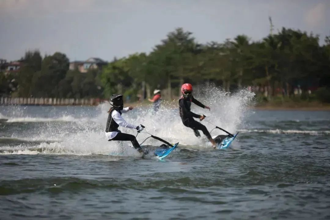 同时,首次亮相世运会的“动力冲浪板”项目也广受关注。运动员脚踏动力板,单手操控电子油门手柄,在200米×200米的浮标赛道间疾驰回转,稍有不慎便可能因错过浮标或危险超车被罚时,一场毫秒必争的顶尖较量即将上演。