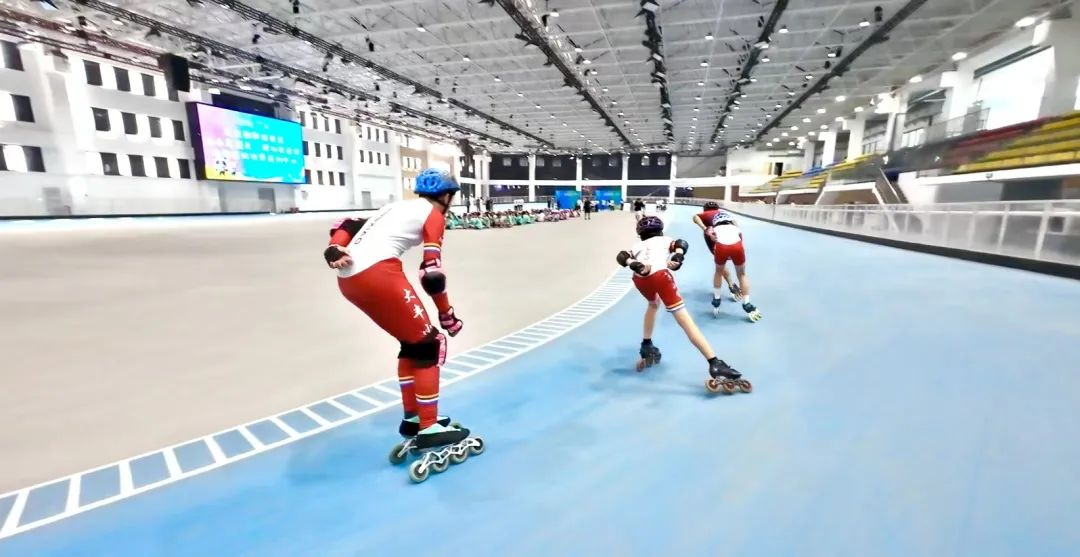 在新都区斑竹园街道成都国际轮滑运动中心,运动员正使用“贴地飞行”的姿态过弯,每分钟均速达600米,在赛道上划出银白色弧线。