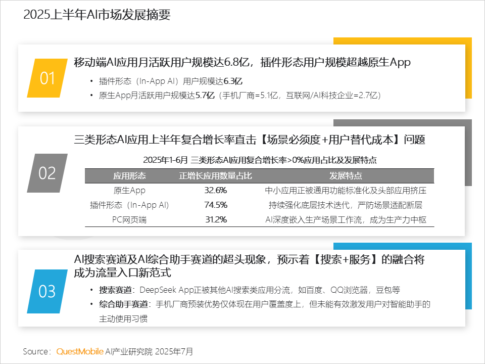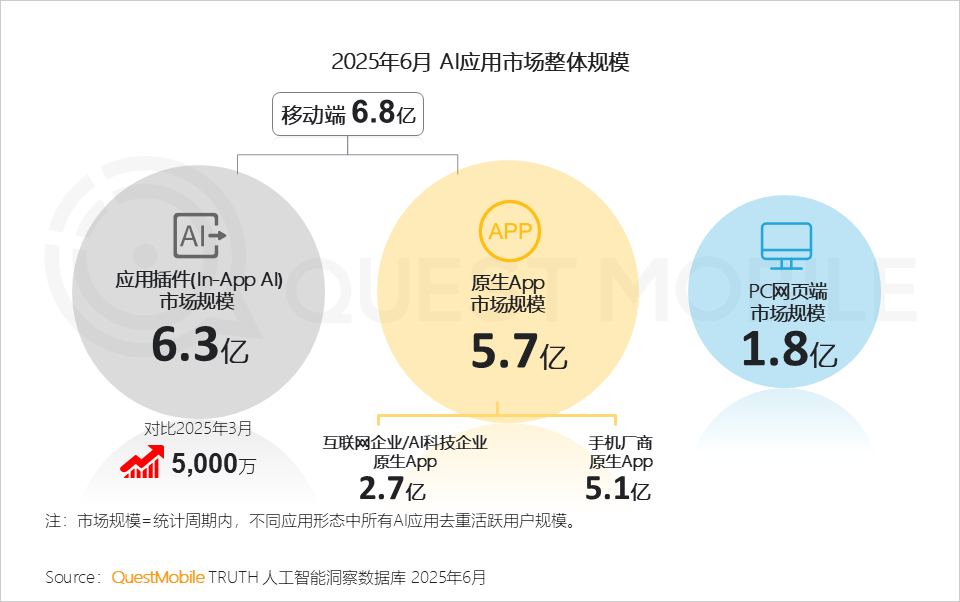 1、2025年6月,移动端AI应用规模达6.8亿,插件形态(In App AI) 的持续增长,底层逻辑来自用户对“无感化”AI体验的需求;手机厂商5.1亿体量暗示着硬件入口的价值重估
