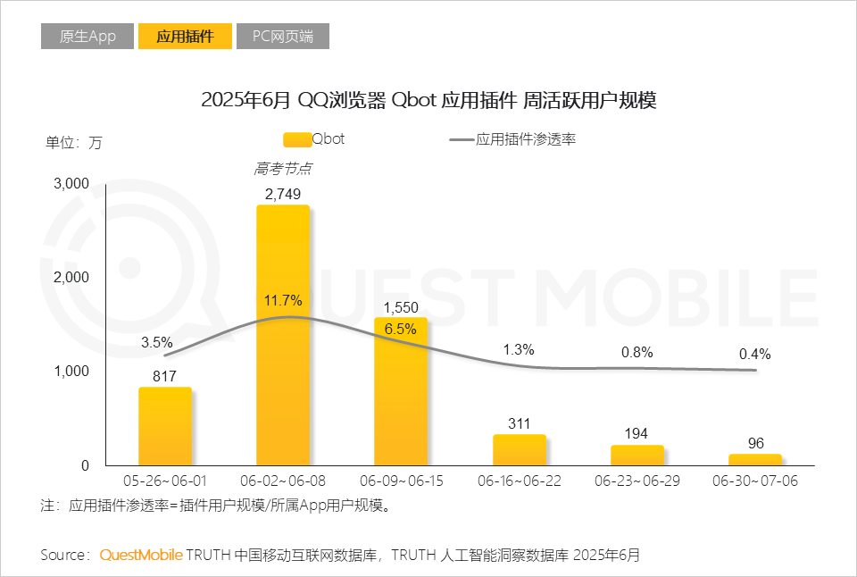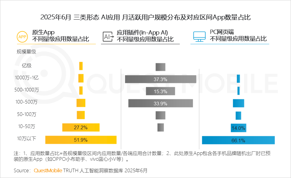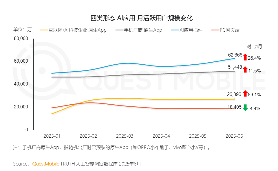 四大梯队应用的表现,落到应用模式上,形成三大类型模式的此消彼长态势。截止到2025年6月,“移动端-应用插件(In-App AI)”用户规模6.3亿,“移动端-原生App”用户规模为5.7亿,“PC网页应用”用户规模为1.8亿,相比3月份变化分别为增长0.5亿、下降0.2亿、下降0.3亿。