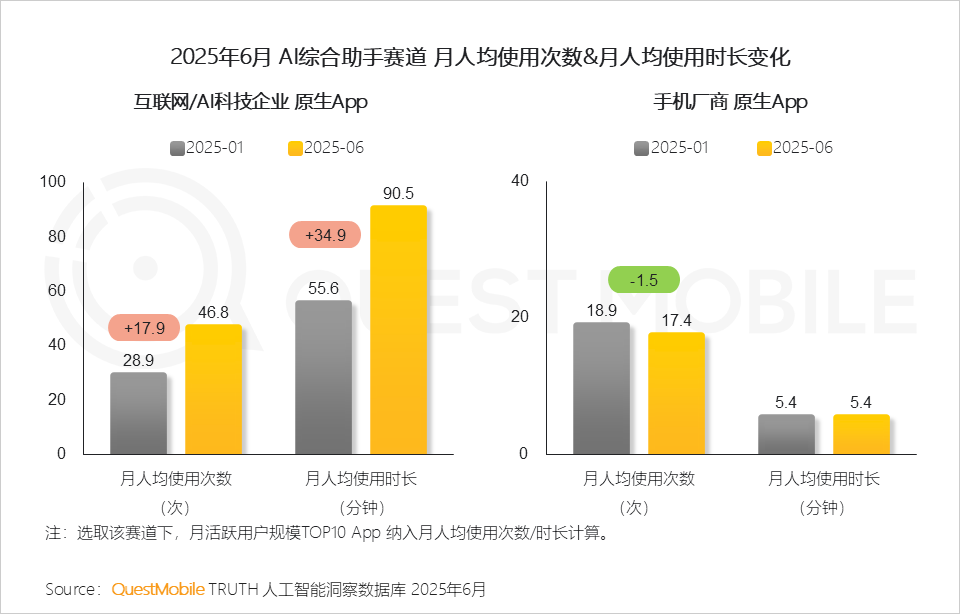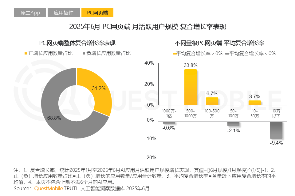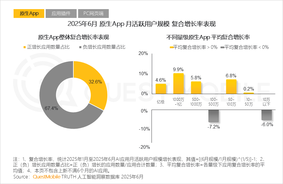 与此相关,PC网页端玩家早已进入淘汰赛,八成玩家用户量在50万以下、68.8%玩家负增长;原生APP市场也进入洗牌期,整个上半年,近七成原生APP玩家负增长,尤其是手机厂商预装的AI手机助手,以及中长尾玩家,在使用场景缺失叠加同质化的问题下,增长乏力……