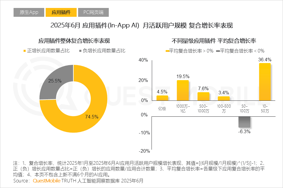5、74.5%的插件形态应用保持正增长,但明显呈结构分化(不同量级区间增速差异较大),需时刻保持底层能力迭代,同时密切警惕“场景嵌入失效”